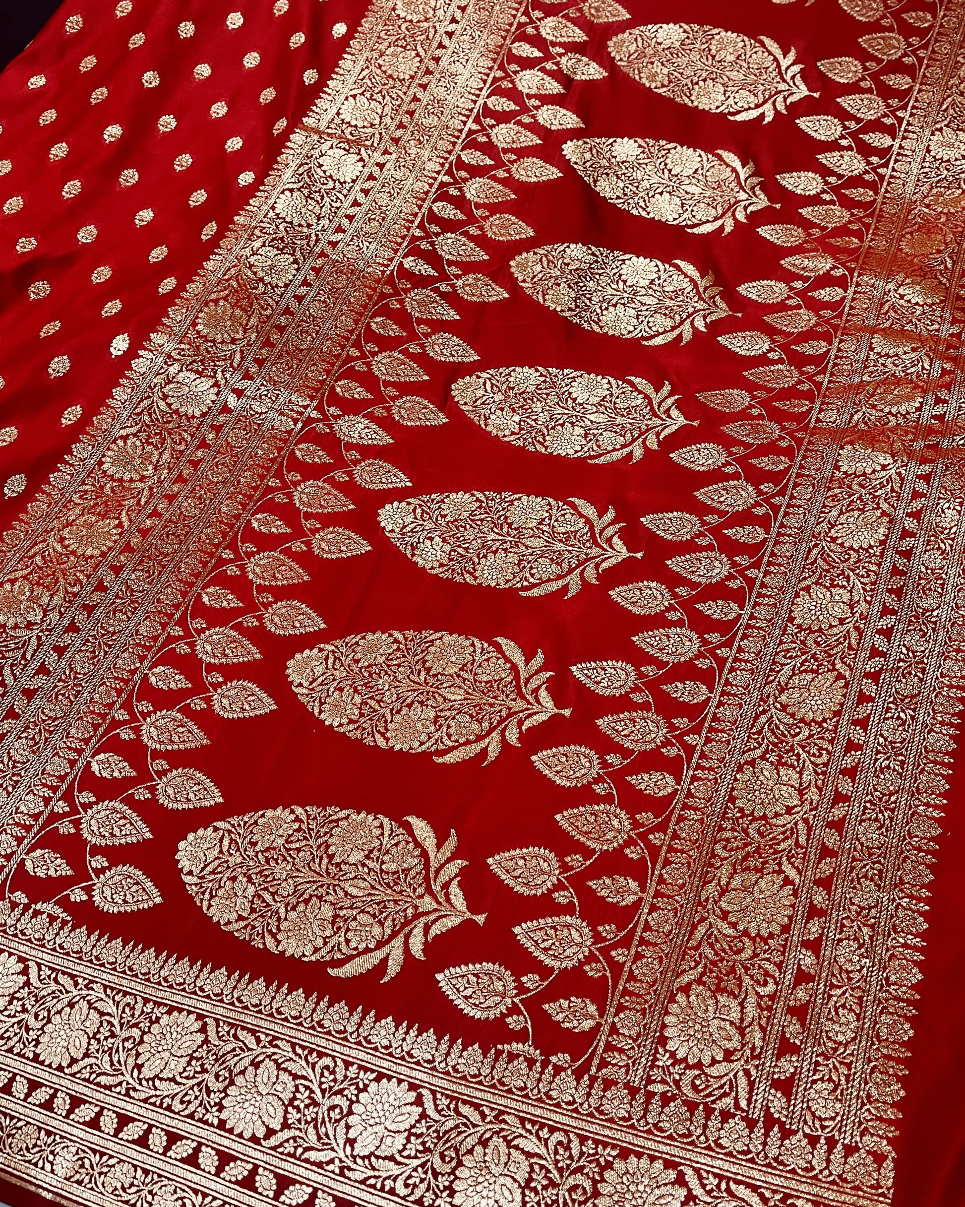 This saree is crafted in pure Banarasi Mashru Silk, known for its rich shine, smooth & Soft texture, and traditional elegance. The fabric features a silk-only weave, offering a luxurious feel with a graceful, fluid drape.